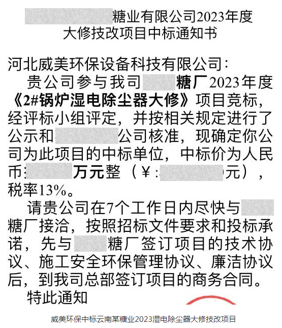 近日,威美環(huán)保中標(biāo)云南某糖業(yè)2023年度濕電除霧器大修技改項目。