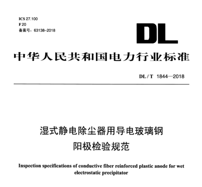 濕式靜電除霧器用導(dǎo)電玻璃鋼陽極檢驗規(guī)范 DL/T 1844-2018于2018年4月3日國家能源局發(fā)布,2018年7月1日實施。