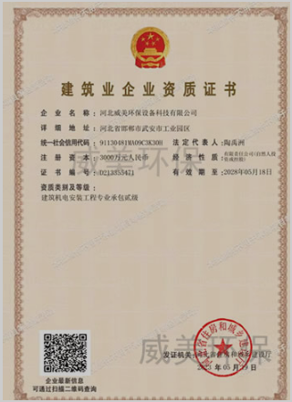 建筑業(yè)的企業(yè)資質(zhì)證書是企業(yè)資產(chǎn),是對威美人才力量與作業(yè)能力的肯定。河北威美環(huán)保設(shè)備是一家集設(shè)計(jì)、制造、安裝、調(diào)試濕電除霧器、脫硫設(shè)備于一體的高新型技術(shù)企業(yè)。河北威美環(huán)保堅(jiān)持在尾氣治理設(shè)備制造領(lǐng)域中不斷創(chuàng)新發(fā)展,目前已有百余臺設(shè)備運(yùn)行在燃煤鍋爐、金屬冶煉、氰尿酸、磷化工、生物質(zhì)(糖廠/糠醛)鍋爐、高性能纖維、垃圾焚燒等領(lǐng)域。我們通過電話溝通,實(shí)地考察測量,為您的生產(chǎn)線量身定制尾氣治理方案。威美環(huán)保將持續(xù)深耕于煙氣治理設(shè)備制造領(lǐng)域,進(jìn)一步加大技術(shù)的開發(fā)和創(chuàng)新力度,并不斷增強(qiáng)自身的核心競爭力,推動高質(zhì)量的發(fā)展。