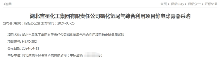 河北威美環(huán)保中標(biāo)磷化氫尾氣綜合利用濕電除霧器項(xiàng)目