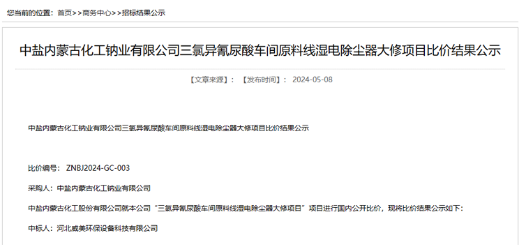 河北威美環(huán)保中標(biāo)中鹽內(nèi)蒙古三氯異氰尿酸車間濕電除霧器大修項(xiàng)目